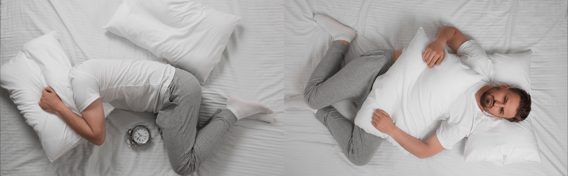 Mann mit Schlafstörungen wälzt sich im Bett.
